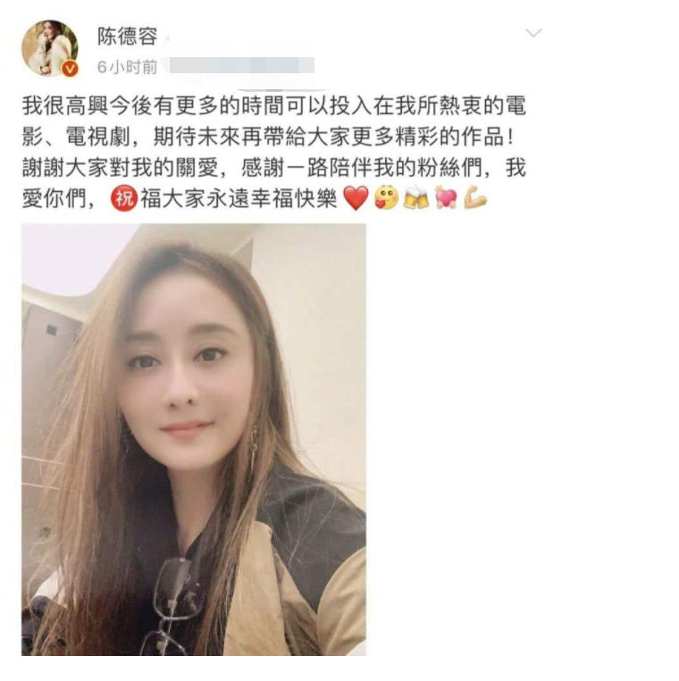 所以在2020年5月1日,也就是她46岁生日当天,陈德容在社交平台上发文宣布复出(她有宣布退圈过吗?),还称会带来更好的作品。