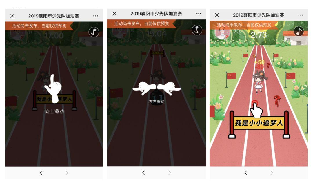 STEP2:手指“向上滑动”跨栏→手指“左右滑动”躲避障碍物→ 吃到红领巾和团徽得分,撞上栏杆和障碍物扣分;