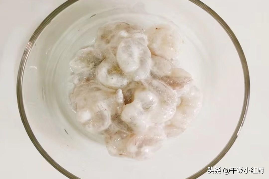 3.虾仁中加入少许食盐、料酒抓拌均匀,然后打入一个蛋清增加滑嫩感,继续搅拌让蛋清都裹在虾仁上面;再捏入一小撮淀粉锁住水分,最后淋入少许油封住,拌匀腌制5分钟。