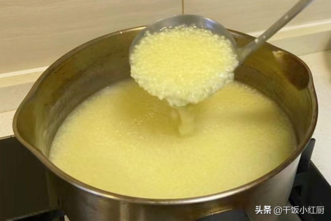 3.然后转为小火继续熬20分钟,注意熬的时候千万不要把锅盖盖严实,留点缝、省得扑锅,而且熬的过程中要经常搅拌,均匀受热的同时防止糊锅,这样才能把小米中的营养都熬出来。