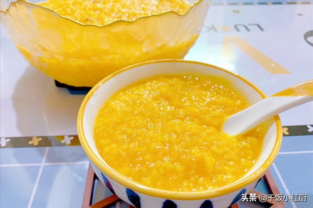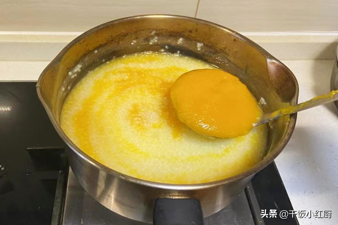 5.南瓜泥下锅以后稍微调大点火力,继续一边搅拌一边熬,把南瓜中的水汽蒸发出去,最终熬好的小米粥就如你看到的这样,浓郁、顺滑、香甜、诱人,早上喝一碗,滋补又舒心,一天都有精神头。