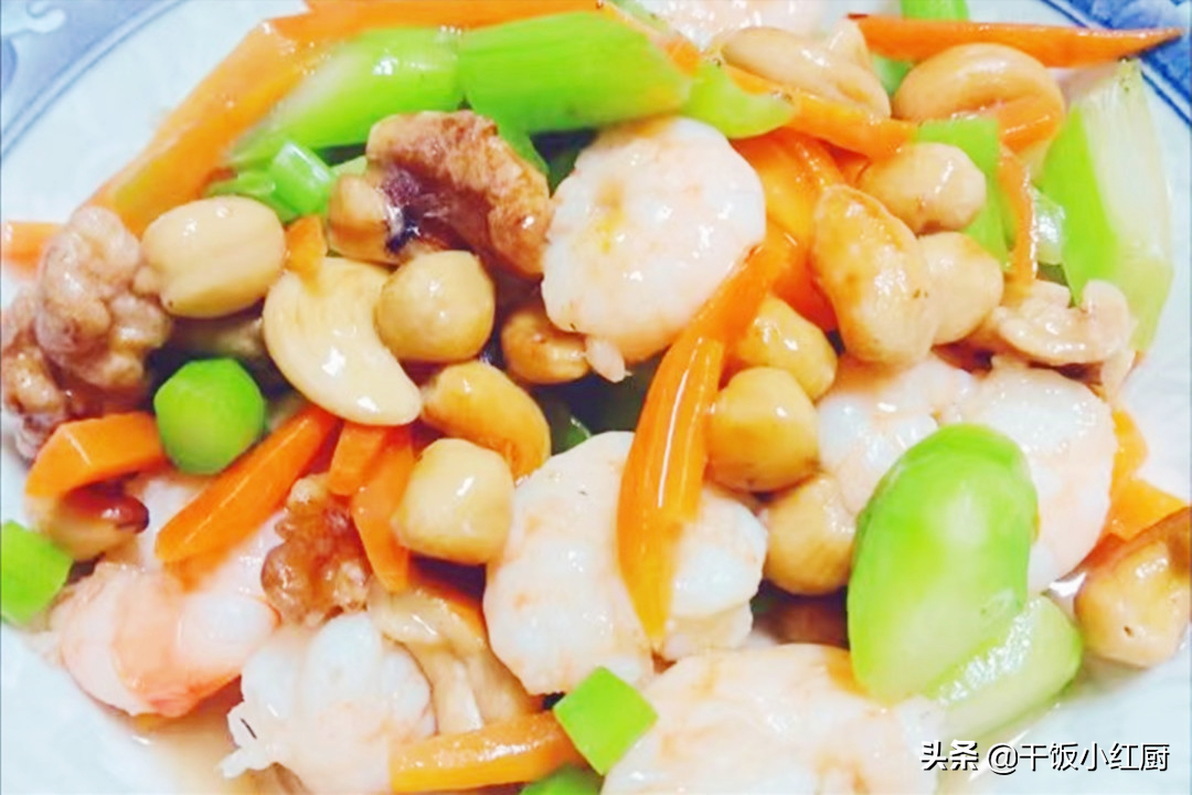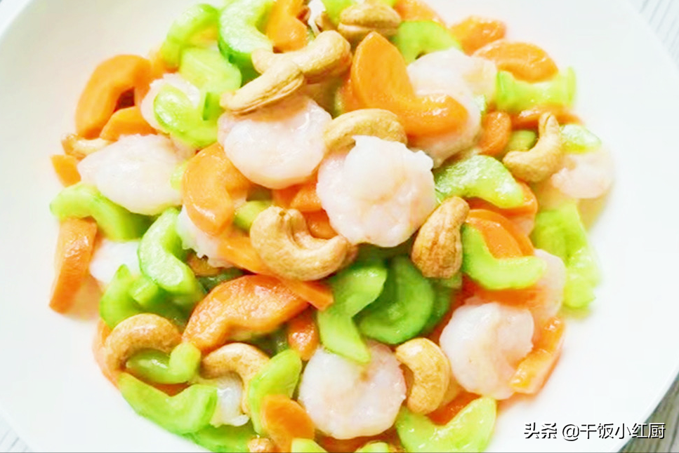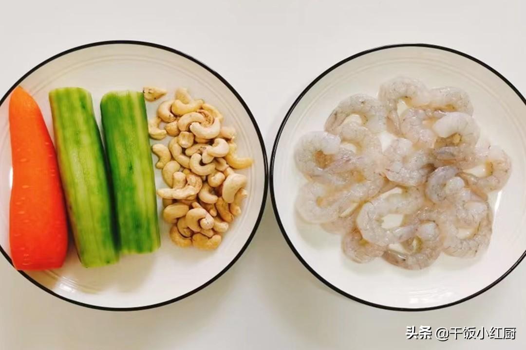 1.首先准备一下所需要的食材:一根洗净的胡萝卜、一根去皮的黄瓜、适量的腰果仁,鲜虾仁用清水洗干净备用。
