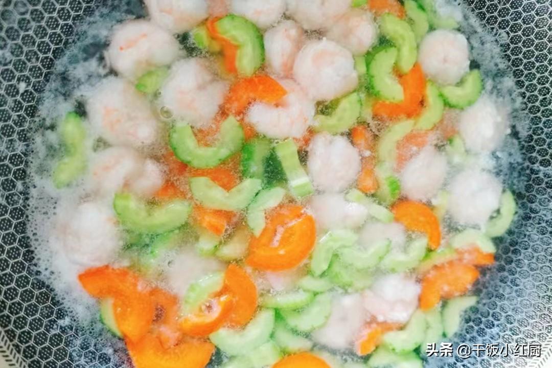 5.锅里烧水,加入少许食盐和植物油,增加底味的同时锁住营养、保持色泽,大火烧开以后先放入虾仁煮一分钟,虾仁变红以后倒入黄花和胡萝卜继续汆煮10秒钟捞出来控水。