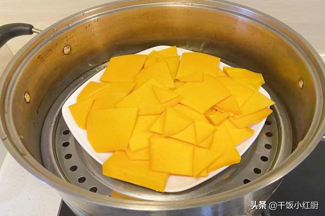 1.首先把南瓜去皮、切成片,放入蒸锅中蒸20分钟,主要是为了方便后期压成南瓜泥。