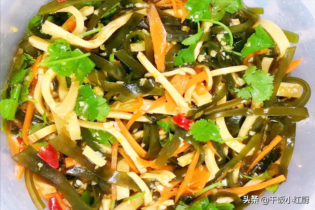1.做凉拌三丝一般都少不了豆腐皮、海带和胡萝卜,把它们都清洗干净、分别切成细丝,然后开水下锅,加入少许食盐汆煮一下,把食材煮熟的同时去除腥味,两分钟以后捞出来,快速过一下凉水,保持口感和色泽,放在一边控水备用。