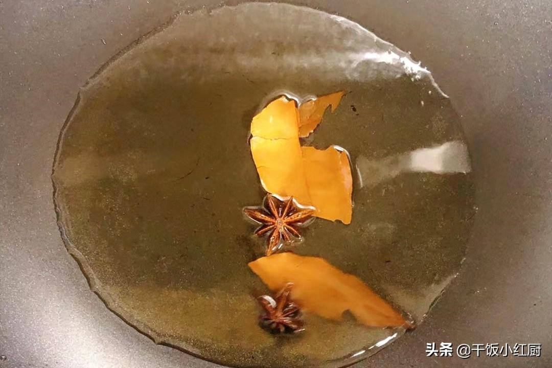 3.锅里烧油,放入八角、香叶小火炸出香味,然后把大料挑出来、只用料油。