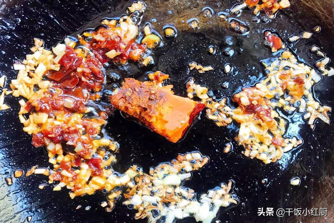 5.锅里再烧油,放入葱姜蒜末爆香,加入一勺豆瓣酱、一小块火锅底料一起炒化、炒出红油。
