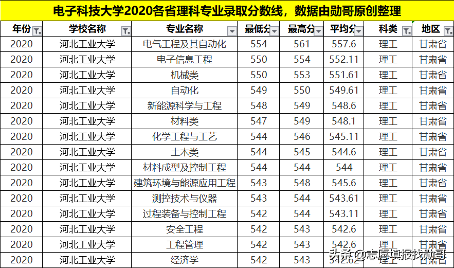 4、河北工业大学2020年在甘肃的各专业录取分数线