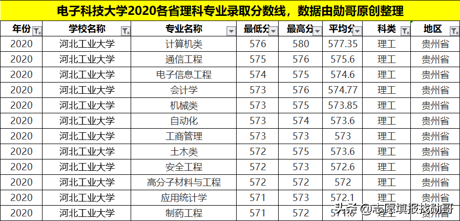 6、河北工业大学2020年在贵州的各专业录取分数线