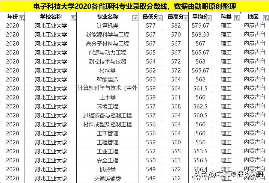 15、河北工业大学2020年在内蒙古的各专业录取分数线
