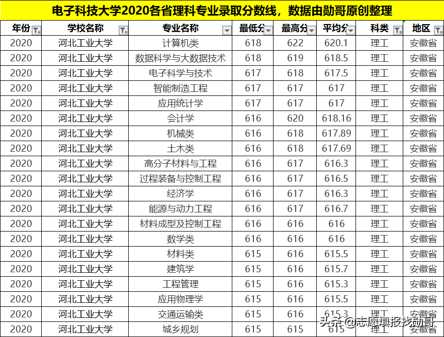 2、河北工业大学2020年在安徽的各专业录取分数线