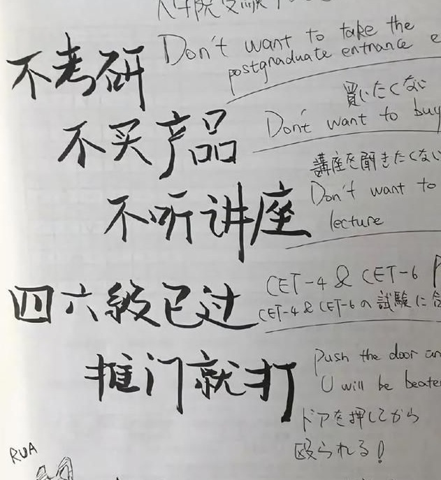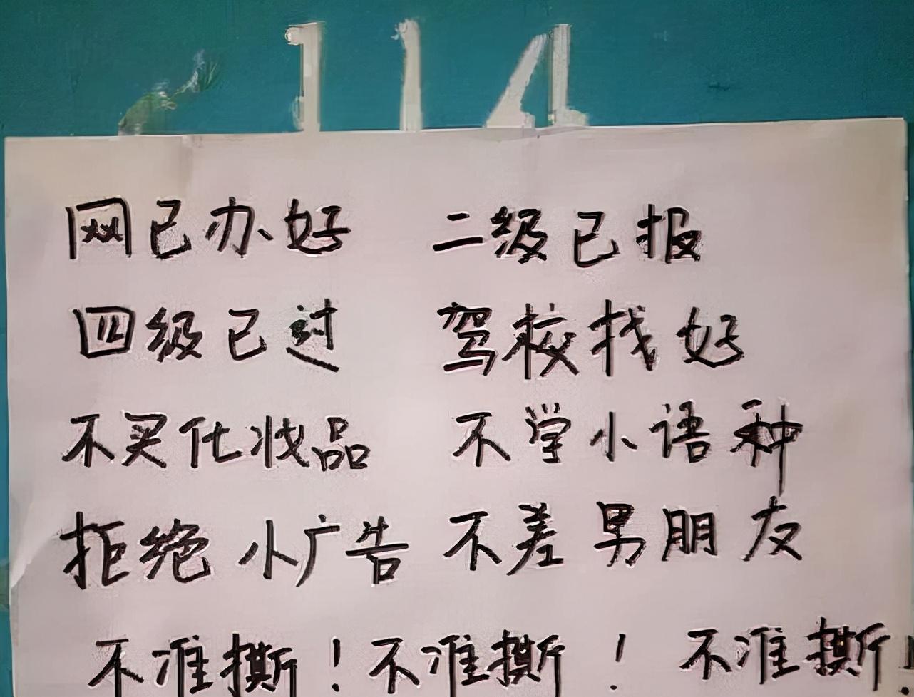 但是这个大学生寝室标语有点“狂”,不考研、不听讲座、四六级已过、推门就打,还是“三语”版本的,学姐看了也会绕道走,学生也表示:正合我意,没有办法,为了阻挡学姐推销。