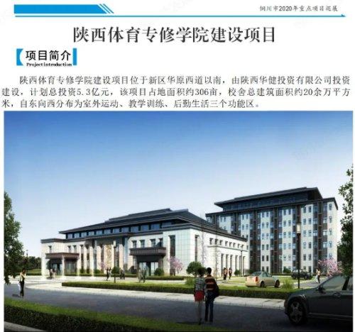 陕西体育专修学院位于新区华原西道以南,由陕西华健投资有限公司投资建设,计划总投资5.3亿,该项目占地面积约306亩,校舍总建筑面积约20余万平方米,自东向西分布为室外运动、教学训练、后勤生活三个功能区。