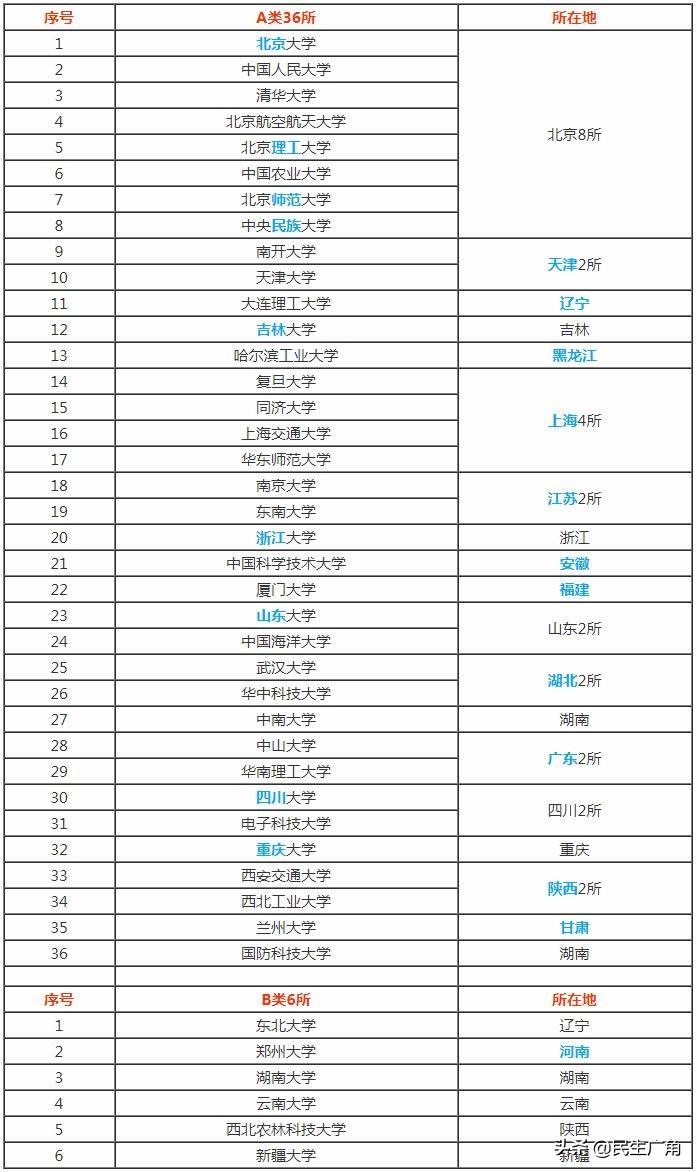 从名单中可以看出,世界一流大学A类高校36所,且这36所高校以前全是985高校;B类高校6所,其中东北大学、湖南大学、西北农林科技大学以前为985大学,另外的郑州大学、云南大学、新疆大学以前为211大学。