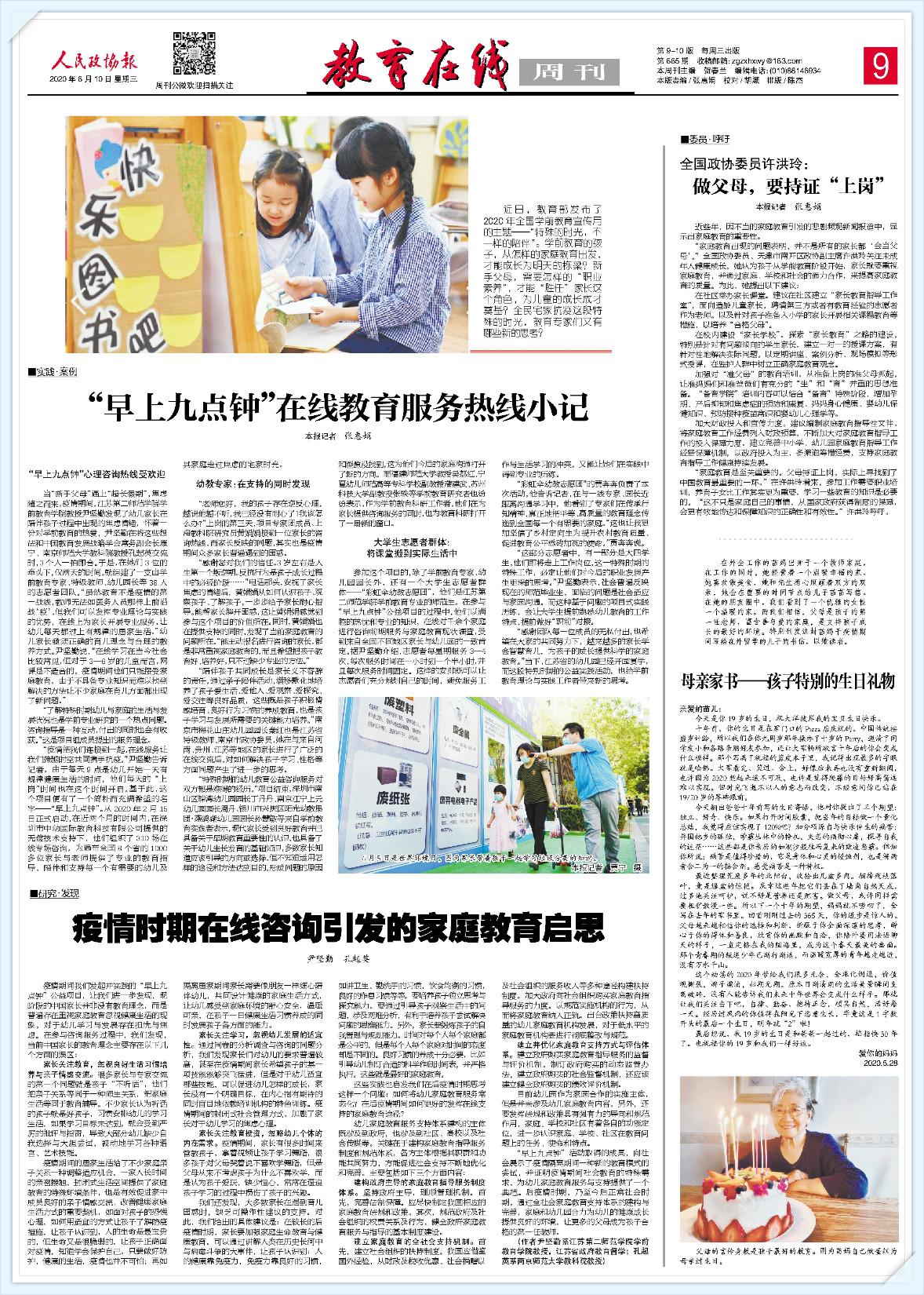 “疫情把我们连接到一起,在线服务让我们跨越时空共同携手抗疫。”尹坚勤告诉记者,由于每天9点是幼儿开始一天有规律健康生活的时间,他们每天的“上岗”时间也在这个时间开启。基于此,这个项目便有了一个简朴而充满希望的名字———“早上九点钟”。从2020年2月15日正式启动,在近两个月的时间内,在深圳市中幼国际教育科技有限公司提供的无偿技术支持下,他们组织了310场在线专场咨询,为遍布全国8个省的1000多位家长与老师提供了专业的教育指导,陪伴和支持每一个有需要的幼儿及其家庭走过焦虑的宅家时光。