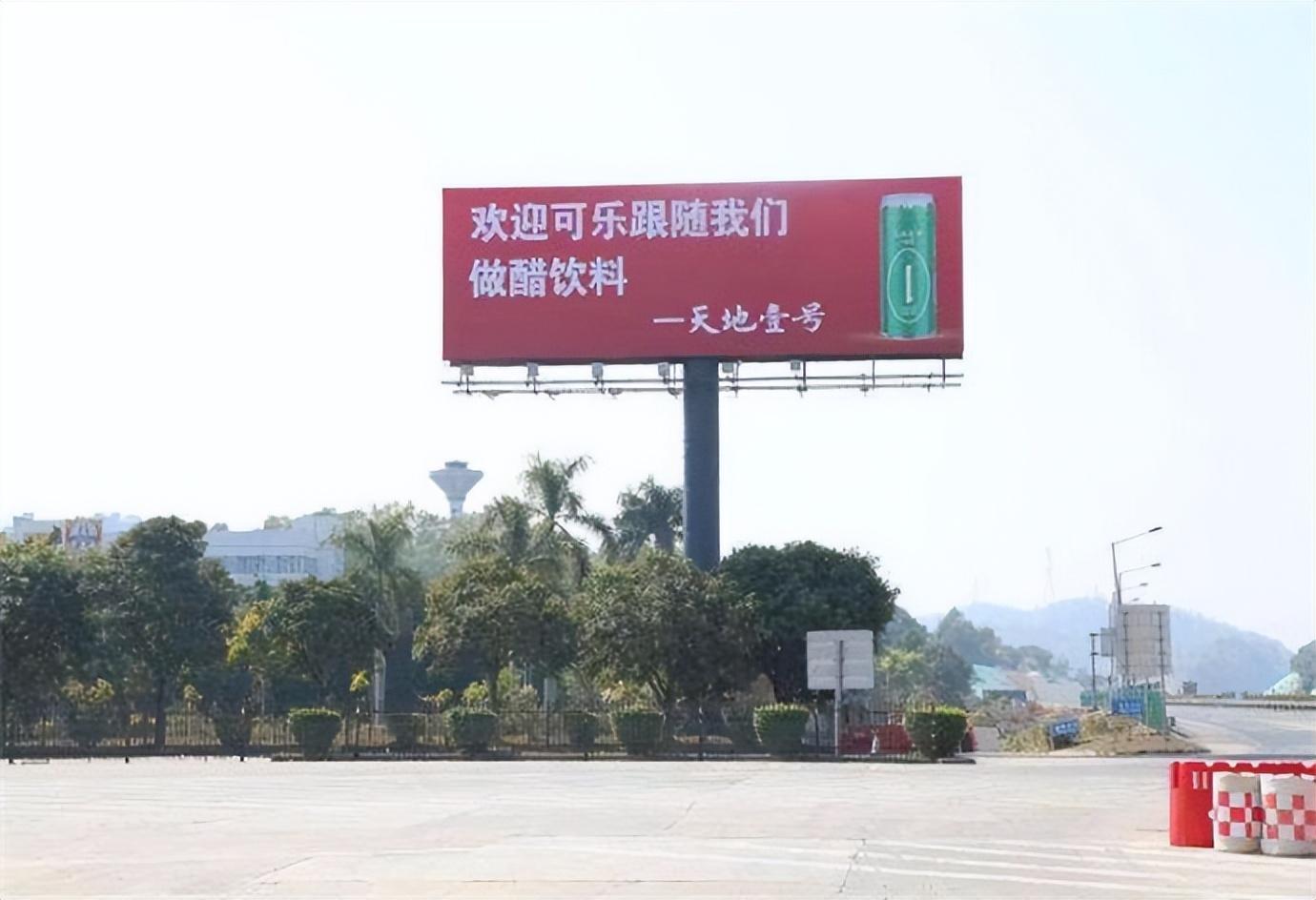 2021年,在广东省出省的高速主干道上,有人注意到一旁竖立的大广告牌上写着“欢迎可乐跟随我们做醋饮料”,下方署名正是天地壹号。