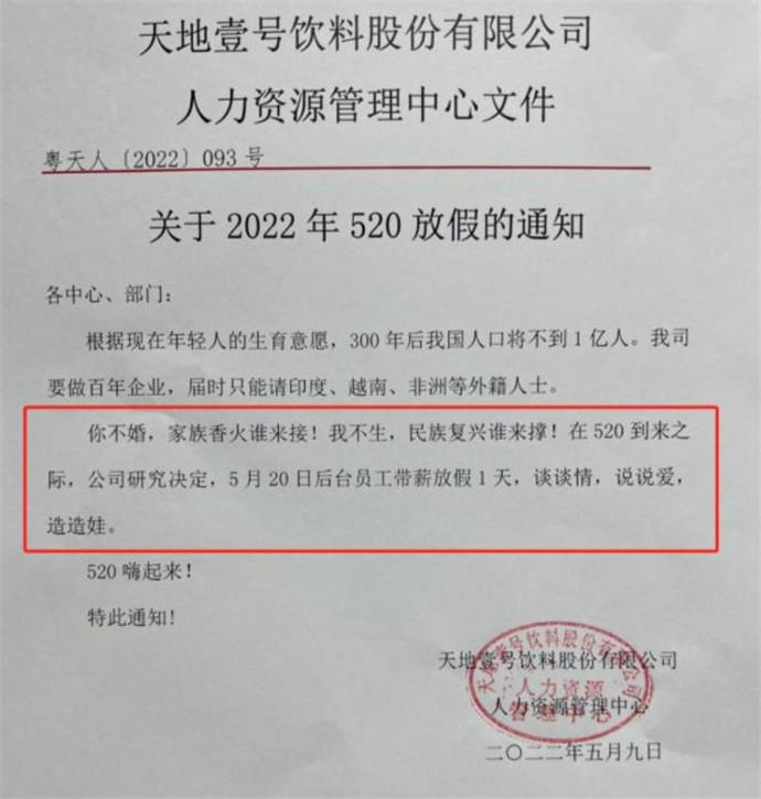 天地壹号老板陈生发布的一则通知让他冲上了热搜,网友纷纷感叹这是什么“神仙老板”,有人在说“管它什么节,不用上班就行”的同时,也有人对此发出质疑,认为陈生此举不过是在作秀“好饮料,放天假省出几千万广告费。”
