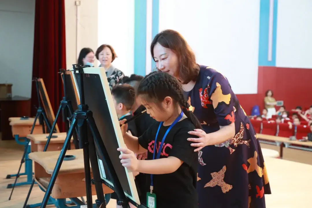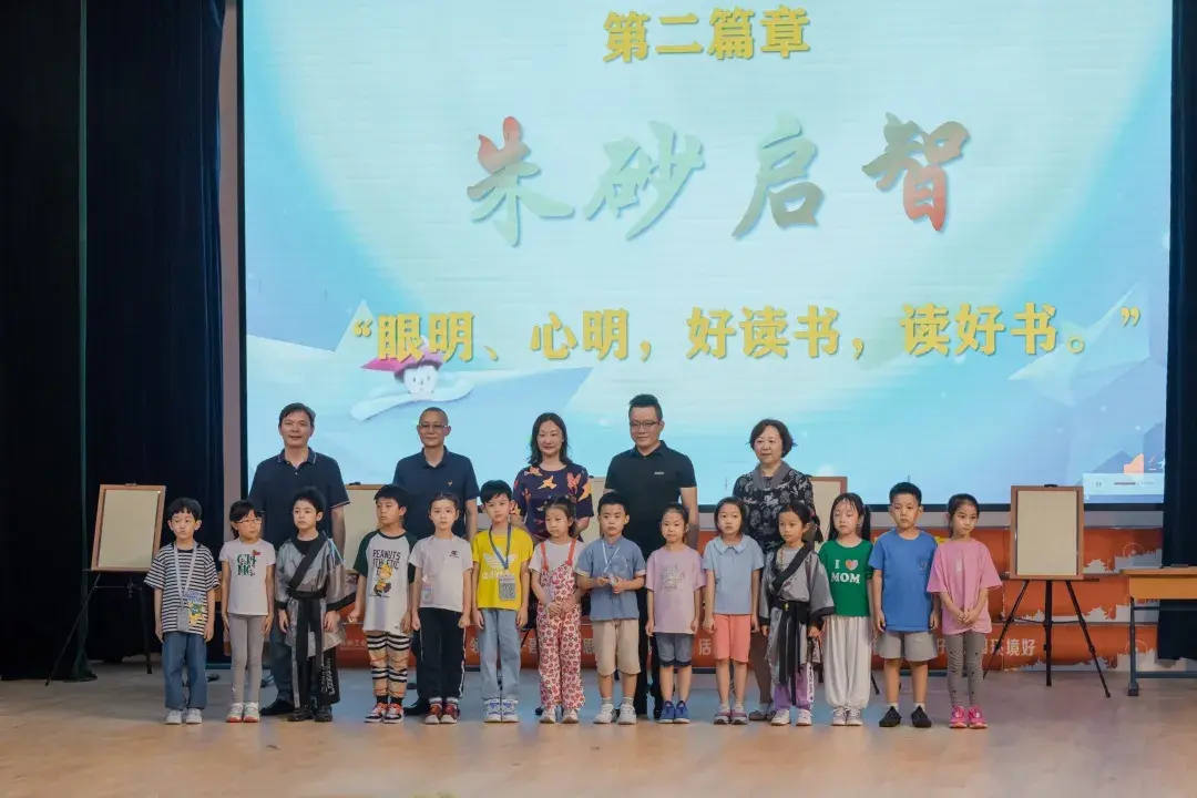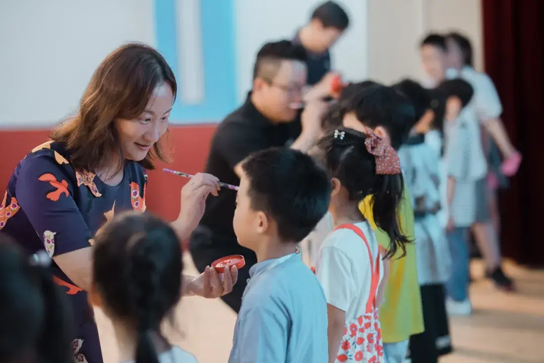 点朱砂,以启智。老师们走进孩子们中间,在他们眉间点上朱砂,送上温馨的祝福。点上朱砂,从此“眼明、心明,好读书,读好书。”
