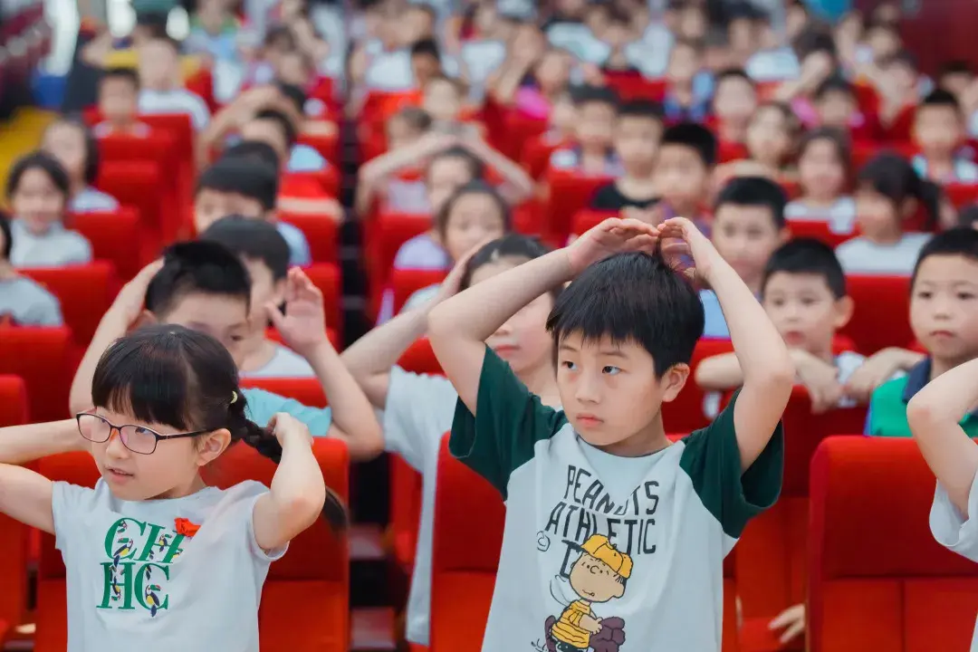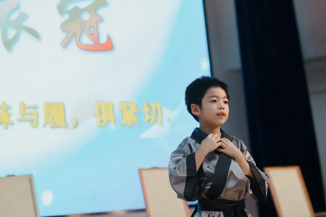 “咚咚咚”鼓声响起,主持人“齐正衣冠”令下,一年级星海娃们低头检查自己的穿戴,捋一捋头发,整一整衣领,拉一拉衣角,提一提裤子,跟随主持人一起齐诵:“冠必正,纽必结,袜与履,俱紧切”。