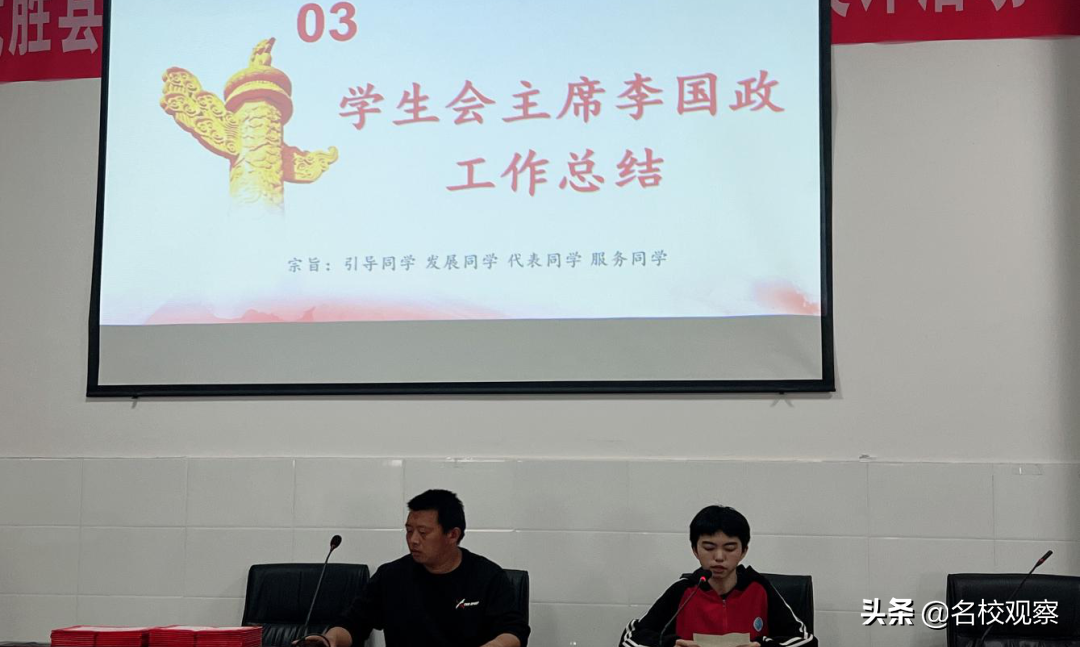 会议第三项议程:初2019级学生会主席李国政进行工作总结。李主席的发言,语言铿锵而有力,字字带着期许与责任。这大概就是薪火相传,生生不息背后的力量和使命。