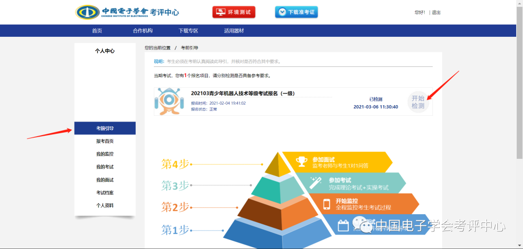 考生登录后请点击考前引导中的报名项目右侧的“开始检测”按钮,进行环境测试。