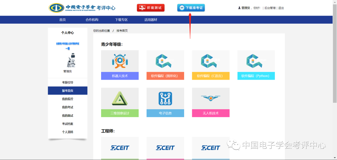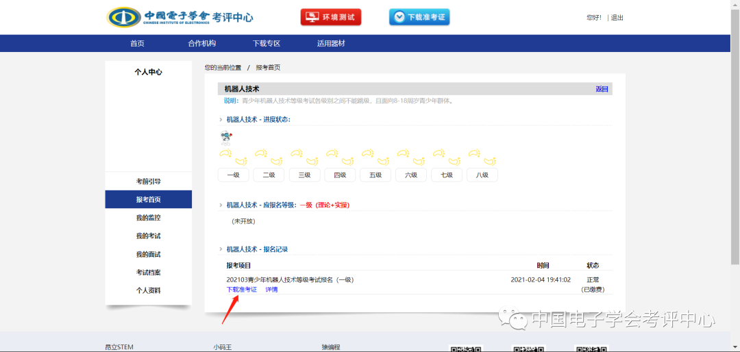 第二处位置:登录官网后,点击报考首页,选择已报考专业(以报名机器人技术为例),点击机器人技术,然后下拉找到自己的报名记录,找到本次考试的报考项目(202103),点击下载准考证。