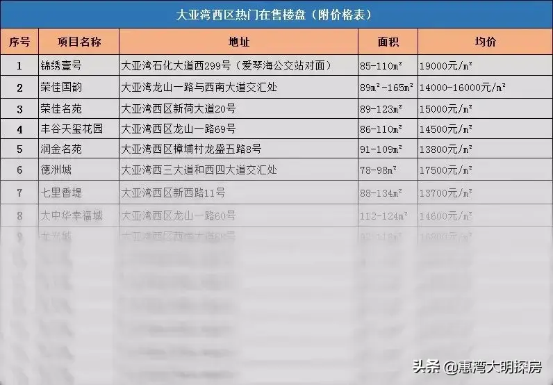 如今,大亚湾的落地教育项目逐年增多,教育资源配置也在不断优化,以后家住这附近的孩子上学将更加方便,住在附近的话小孩上学也更便利,下面我们一起来看看周边的楼盘都有哪些?