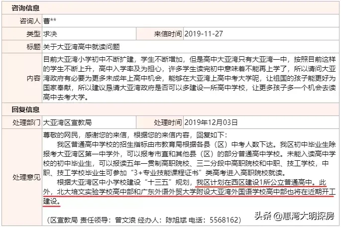 此外,针对大亚湾区人口数量迅猛增加的发展趋势,大亚湾北大培文实验学校高中部和广东外语外贸大学附设大亚湾外国语学校高中部也将在近期开工建设。