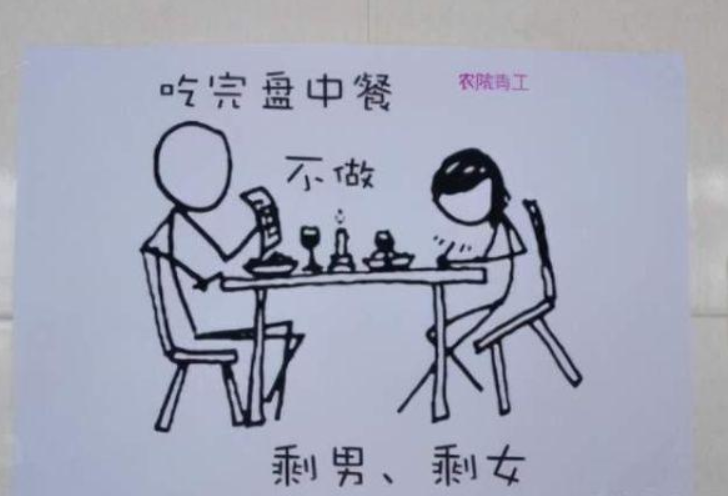 俗话说得好“粒粒皆辛苦”,学生应该珍惜每粒粮食,应该珍惜现在的生活。因此这个标语就是要教育学生们,不能浪费一粒食物。不然的话可真就成了剩男剩女了。