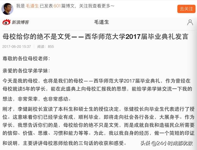 在一篇毛校长的文章里,可以读到,他对自己要成为什么样的教师的描述。那是2017年,毛道生曾在西华师范大学学生的毕业典礼上,为应届毕业生做的分享,他讲到三位学校教师对他的启示。