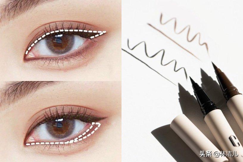 眼线部分可以直接跟着眼型画,注意眼尾可以稍稍上扬来调整眼型,眼线不用画太粗,也可以只画后半截就好。如果不喜欢太锐利的感觉,也可以用小扁刷沾取深色眼影取代眼线。下眼线的部分则建议用深色眼影,往眼尾平行画出去,与上眼睑形成一个开放式的眼角,可以在视觉上拉长眼型,对于内双或窄双来说有放大双眼的效果。