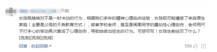 女孩跳楼绝对不是一时冲动的行为,根据我们多年的精神心理临床经验,女孩极可能遭受了来自原生家庭(主要是父母的不良教育方式),或者学校老师,甚至是周围同学的叠加性心理创伤,老师用尺子打手心的举动再次激活了心理创伤,导致她做出轻生的行为。可悲可叹!女孩生前经历了什么?