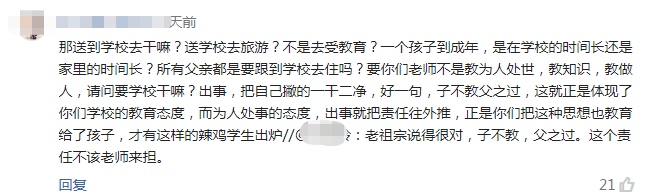 那送到学校去干嘛?送学校去旅游?不是去受教育?一个孩子到成年,是在学校的时间长还是家里的时间长?所有父亲都是要跟到学校去住吗?要你们老师不是教为人处世,教知识,教做人,请问要学校干嘛?出事,把自己撇的一干二净,好一句,子不教父之过,这就正是体现了你们学校的教育态度,和为人处事的态度,出事就把责任往外推,正是你们把这种思想也教育给了孩子,才有这样的辣鸡学生出炉!
