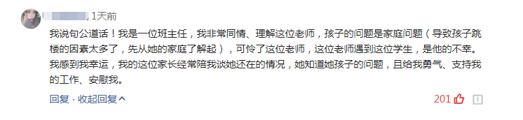 我说句公道话!我是一位班主任,我非常同情、理解这位老师,孩子的问题是家庭问题(导致孩子跳楼的因素太多了,先从她的家庭了解起),可怜了这位老师,这位老师遇到这位学生,是他的不幸。我感到我幸运,我的这位家长经常陪我谈她还在的情况,她知道她孩子的问题,且给我勇气、支持我的工作、安慰我。