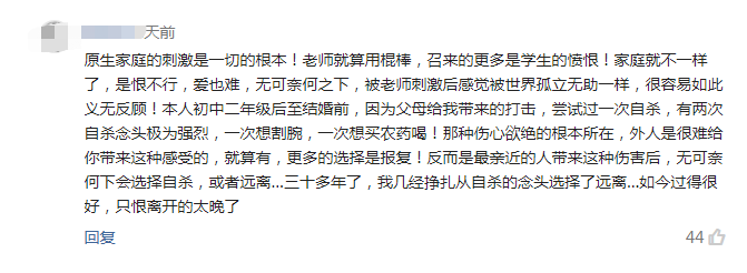 原生家庭的刺激是一切的根本!老师就算用棍棒,召来的更多是学生的愤恨!家庭就不一样了,是恨不行,爱也难,无可奈何之下,被老师刺激后感觉被世界孤立无助一样,很容易如此义无反顾!本人初中二年级后至结婚前,因为父母给我带来的打击,尝试过一次自杀,有两次自杀念头极为强烈,一次想割腕,一次想买农药喝!那种伤心欲绝的根本所在,外人是很难给你带来这种感受的,就算有,更多的选择是报复!反而是最亲近的人带来这种伤害后,无可奈何下会选择自杀,或者远离…三十多年了,我几经挣扎从自杀的念头选择了远离…如今过得很好,只恨离开的太晚了!