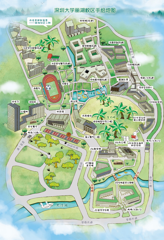 作为诞生了“马化腾”“史玉柱”“孟晚舟”“薛兆丰”等著名校友的深圳大学,在校园环境建设中整体洋溢现代时尚风貌。深圳大学现有粤海、丽湖两个校区,校园总面积2.71平方公里。我们以丽湖校区为例,丽湖校区环境优美,是山水校园。北依羊台山、南临塘朗山,西接高尔夫球场,大沙河穿校园而过,风景秀丽。