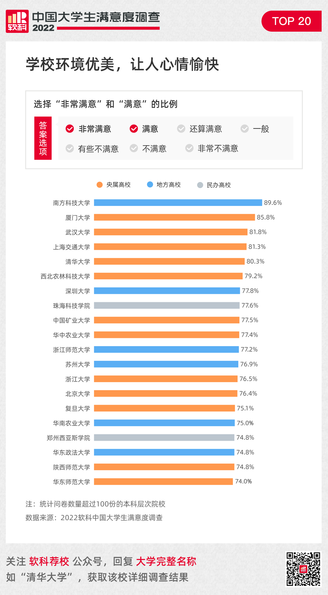 在校园环境满意度部分,满意度最高大学TOP20如下: