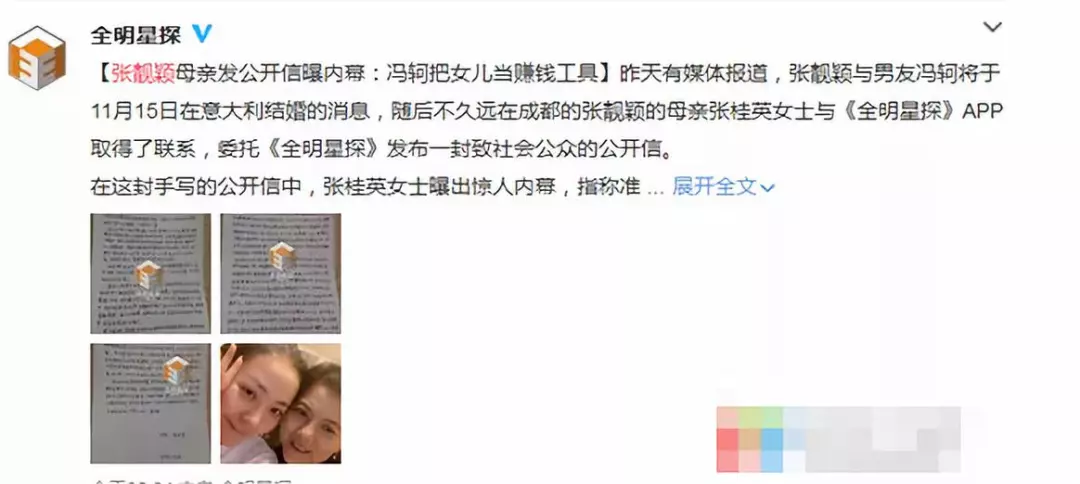 不料,求婚照片刚公布,就遭到了张靓颖母亲的反对。张母向媒体发布了一封公开信,文中字字句句剑指冯轲将女儿当成了他赚钱的工具。