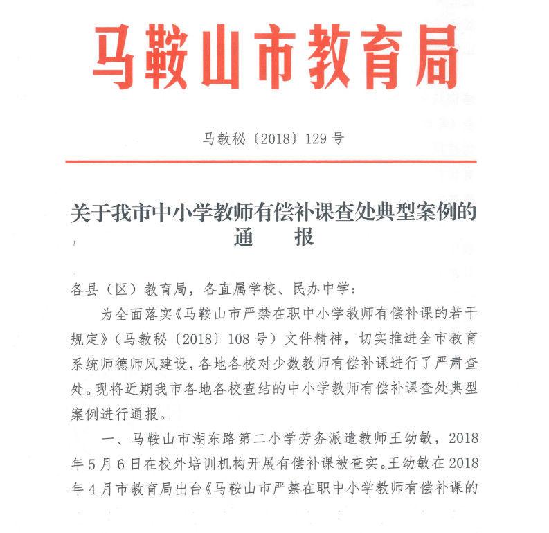 这是马鞍山首次通报中小学教师有偿补课查处典型案例。《通报》要求,各教育主管部门及各学校要及时将通报内容传达到每一位教职工,切实让广大教师从以上典型案例中汲取教训,引以为戒。各教育主管部门及各学校要切实落实主体责任,以严细深实的工作作风,加强教育引导、监督检查,着力推动我市中小学教师师德师风建设取得新成效。