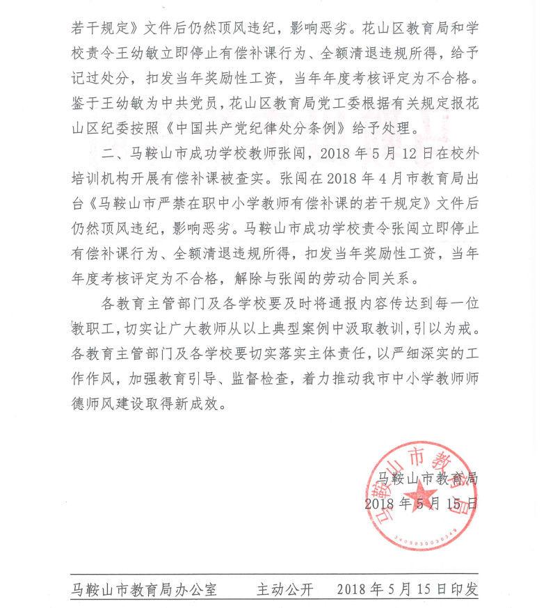 二是马鞍山市成功学校教师张闯,2018年5月12日在校外培训机构开展有偿补课被查实。张闯在2018年4月市教育局出台《马鞍山市严禁在职中小学教师有偿补课的若干规定》文件后仍然顶风违纪,影响恶劣。马鞍山市成功学校责令张闯立即停止有偿补课行为、全额清退违规所得,扣发当年奖励性工资,当年年度考核评定为不合格,解除与张闯的劳动合同关系。