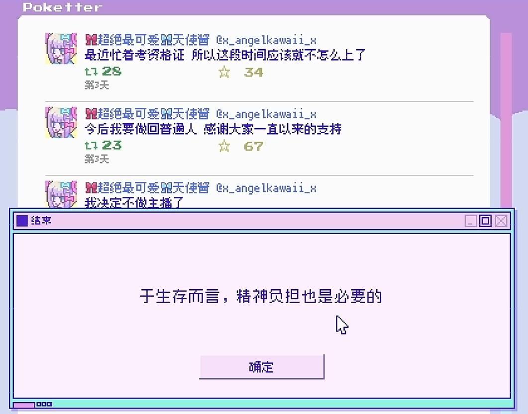 压力过高时,直接销号退出主播生涯,反而是种种结局中对女主角最温柔的那个。稍有不慎,女主会在直播间露出丑态,之后又装做一切都没有发生过似的勉强维持直播,但她和坐在电脑的玩家都知道,流言蜚语和那之下毫不掩饰的恶意已经无孔不入,甚至从网络钻进现实。
