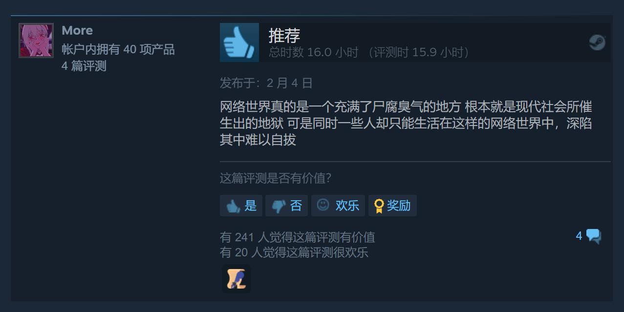 游戏之外的世界也有类似精彩,在Steam商店评论区中文评价中,常常可以见到玩家将这款游戏和悄然兴起的虚拟主播相提并论。虚拟主播形象虽说是虚拟的,却又是一个个真实存在的女孩所扮演,为角色赋予灵魂。她们在工作生活中所遇到的一切,都能和糖糖的故事巧妙对应。