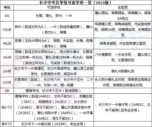最后附上2019年长沙中考各等级可选的学校一览图:
