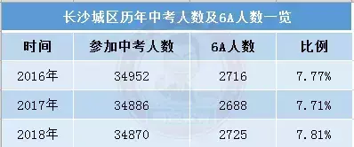 2018年长沙初中毕业生34952人,达到“6A”标准的只有2716人,也就是说,达到四大名校本部普招资格的比例为7.77%。而今年湖南高考一本录取率为13.28%