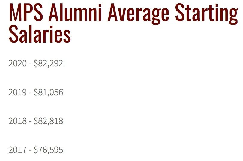 2020届MPS学生的毕业平均起薪,达到了$82,292/年的水平,毕业一年就能将学费赚回来,着实让人不得不佩服。