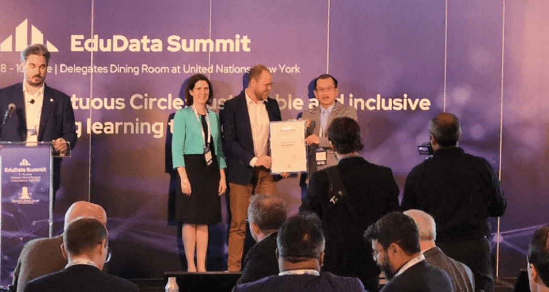 UCSI大学吉隆坡校区署理校长拿督卓建国教授(右一)代表 UCSI 大学,前往美国领取“QS 进步表彰奖”,左一颁奖人为QS董事经理Jessica Turner。