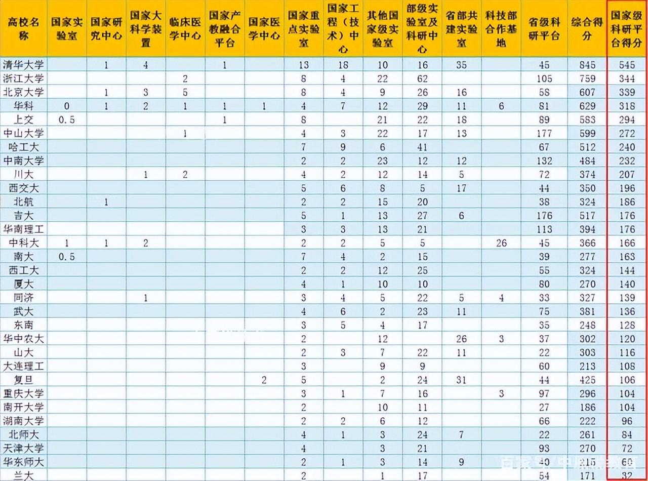 上图的数据统计来自各大高校的官网,其赋分规则为:一个国家实验室得分最高,一个国家实验室得分30分;其次是国家研究中心:每个国家研究中心赋分18;国家大科学装置、国家医学中心以及产教融合平台赋分15;国家重点实验室、国家临床医学中心以及国家工程技术中心赋分12;其他国家级平台赋分8。