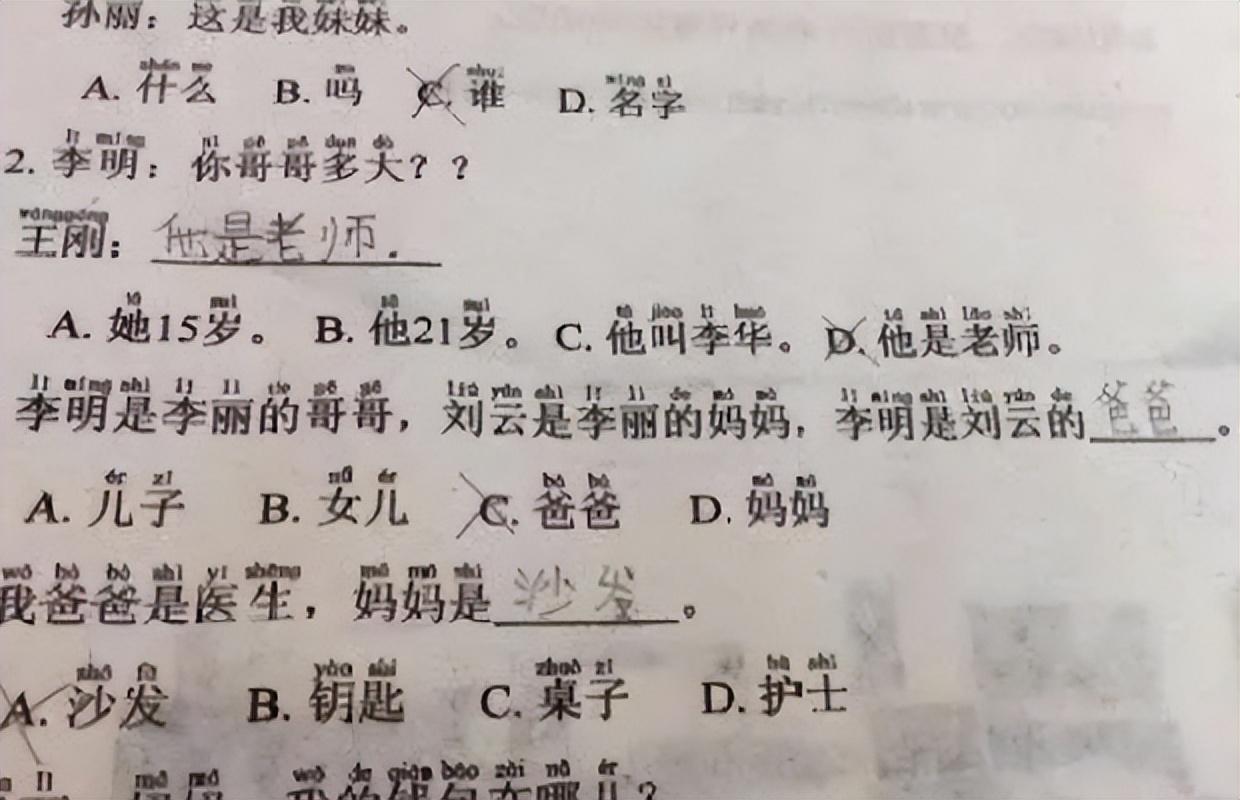 题目是让用家人造句,结果外国学生写的是我不是家人,这是什么句子,从来没有看过,外国学生是自己造了一个新句子出来。