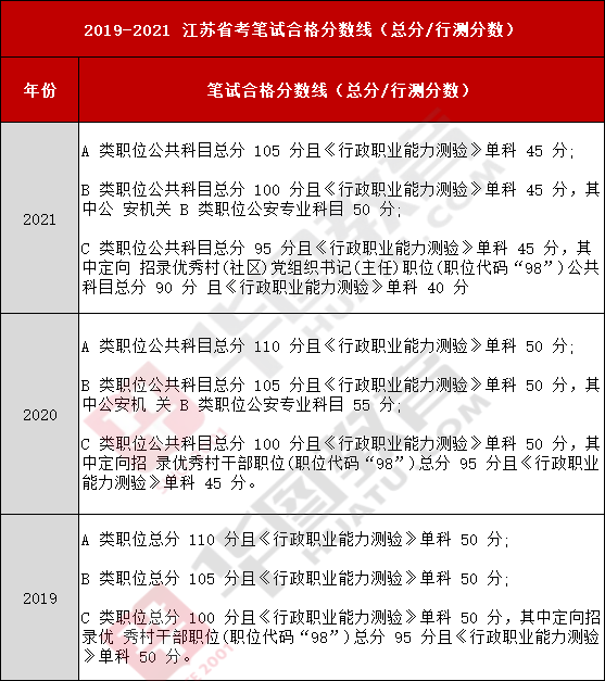 江苏省考合格线分为两个分数线, 分别是总分和行测分数, 必须同时满足。图图给大家汇总了2019年-2021年的笔试合格分数线。