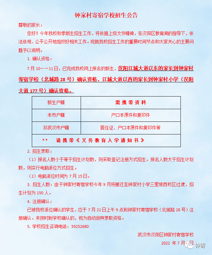 根据《市教育局关于做好2022年义务教育阶段新生入学招生工作的通知》(武教基【2022】7号)工作安排,7月10-11日,为小学新生、双(多)胞胎学生资格认定阶段。现将有关事项通知如下: